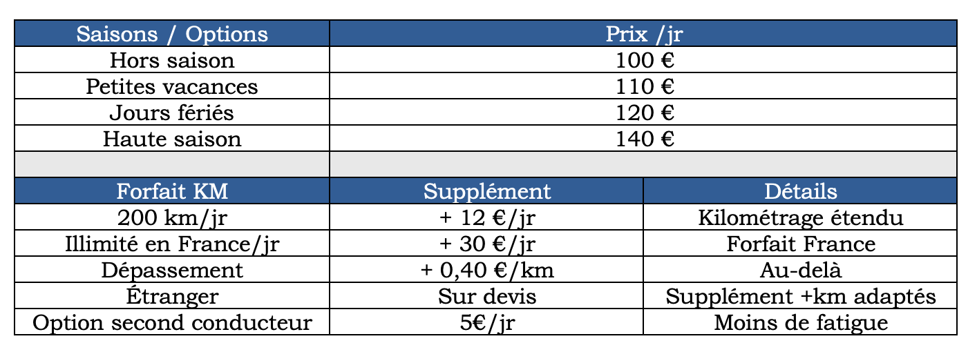 Chez Van Life Location, nous avons fait le choix de proposer des tarifs de location clairs et transparents.